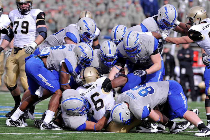 Air Force Falcon defenders swarm Black Knights running back Larry Dixon in the Air Force-Army game at Falcon Stadium in Colorado Springs, Colo., Nov. 5, 2011. The Falcons capitalized on five Army turnovers to defeat the Black Knights, 24-14. (U.S. Air Force photo/Raymond McCoy)