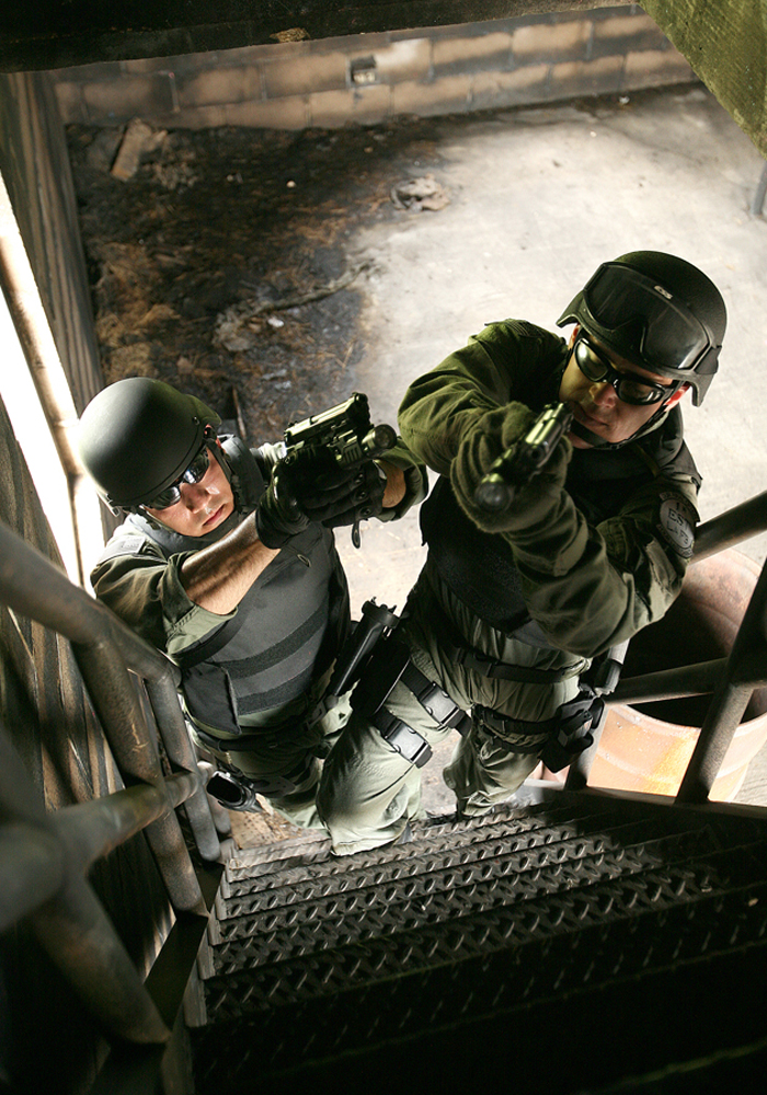 Ronald Thompson cover each other as they make their way up a flight of stairs to the attic to clear a target building during a training session at Lackland Air Force Base, Texas on Friday, May 4, 2007. Garcia and Thompson are members of the 37th Training Wing's Emergency Services Team (EST) at Lackland. EST personnel competed in the Southeast Texas SWAT competition on April 24, 2007 and took a first.