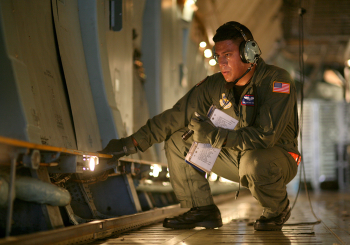 Staff Sergeant Antonio Torres, a flight engineer student performs a preflight check of a C-5