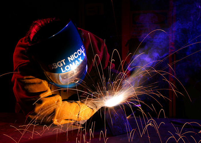 Staff Sergeant Nicole Lomas uses a metal inert gas welding machine to weld a T-joint for her skill level upgrade at Lackland Air Force Base, Texas. Sergeant Lomax is assigned to Air Force Reserve Command’s 433rd Airlift Wing at Lackland Air Force Base, Texas.